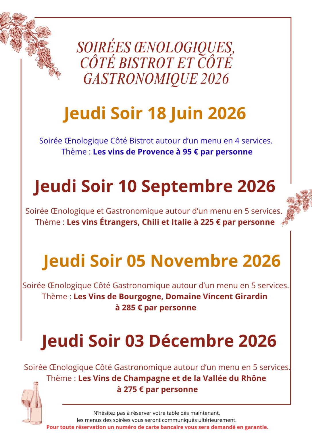 Voici notre calendrier des soirées Œnologiques pour 2026 !
